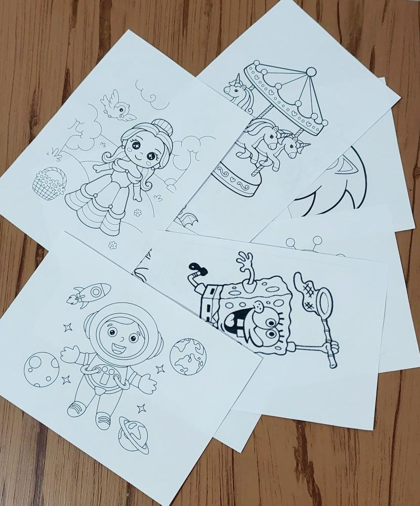8 Desenhos para colorir tamanho A5 (metade de uma folha, não é frente e verso.) impressas em papel sulfite 75 gramas (excelente qualidade);